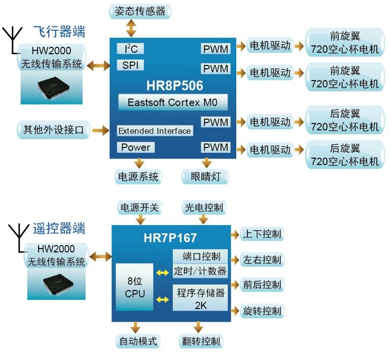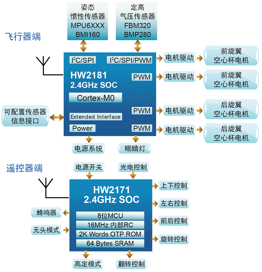 | 2 顆SOC芯片方案 | 飛行器端HW2181,遙控器端HW2171 |