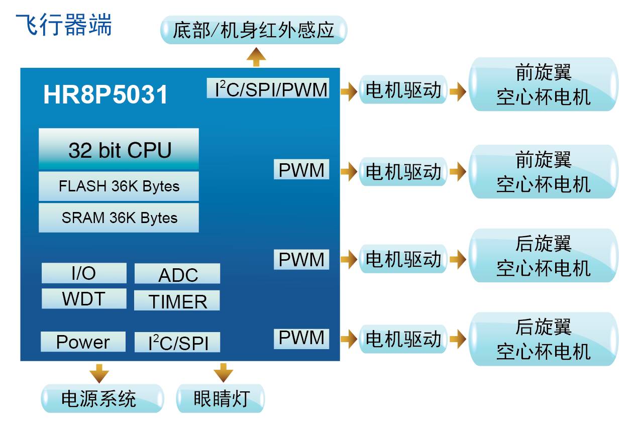 遙控型四軸功能說明: ① 垂直、俯仰、翻滾、偏航、前后、側向等6種基礎飛行模式 ② 四通道遙控器靈活控制 ③ 2.4GHz多信道跳頻遙控協議 ④ 一鍵翻跟斗 ⑤ 多彩眼睛燈 手感應型四軸功能說明: ① 垂直、側向、前后、偏航等4種基礎飛行模式 ② 側飛感應飛行,自動控制飛行器轉向 ③ 一拋即飛,無需遙控操 ④ 底部紅外感應,底部遇到障礙自行飛高 | 特征說明: ① 1顆、2顆SoC、4顆低成本高性能 IC可選 ② 一站式套片供給 ③ 整體解決方案參考 ④ 完整開發工具鏈 ⑤ 快速高效技術支持 |