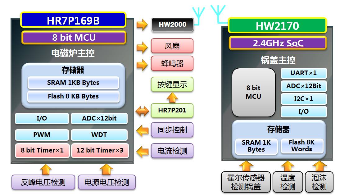 ①低成本、高性能SoC芯片 ②鍋蓋手柄自動(dòng)檢測(cè)溫度和泡沫