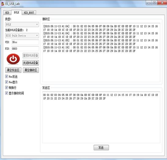打開 ES-USB-Lab 選擇 BULK 一欄,查找到自定義 BULK 設備“ES32 Bulk Device”。打開此設備,在發送區寫入數據,點擊“發送”按鈕,在接收區會收到發送區的數據。