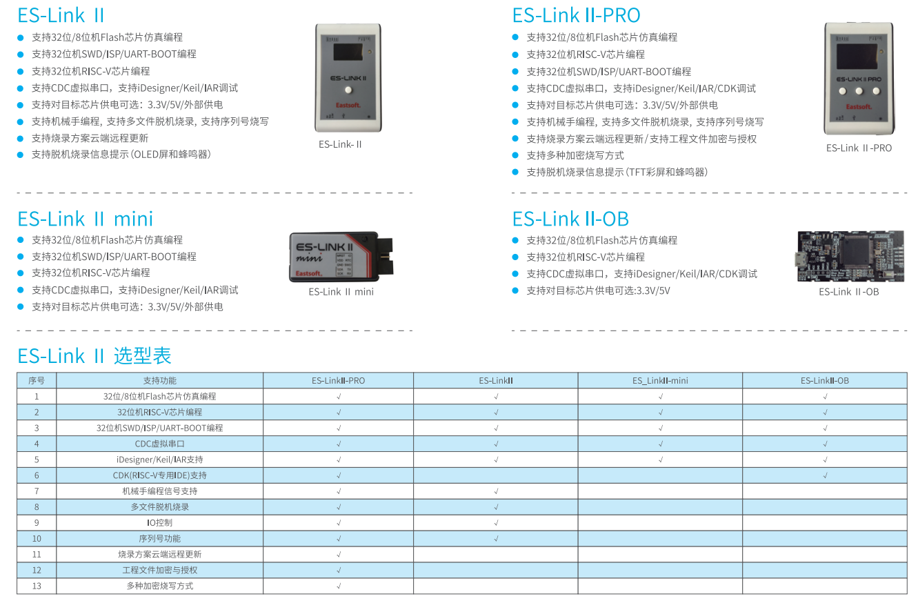 ES-Link II? 是東軟載波微電子開發的一款集在線調試、量產燒錄為一體的低成本調試燒錄工具。兩個版本可供選擇:ES-Link II、ES-Link II-mini。 需要進行量產燒錄則選擇 ES-Link II全功能版本 ;調試開發及少量樣機燒錄則選擇 ES-Link II-mini 。